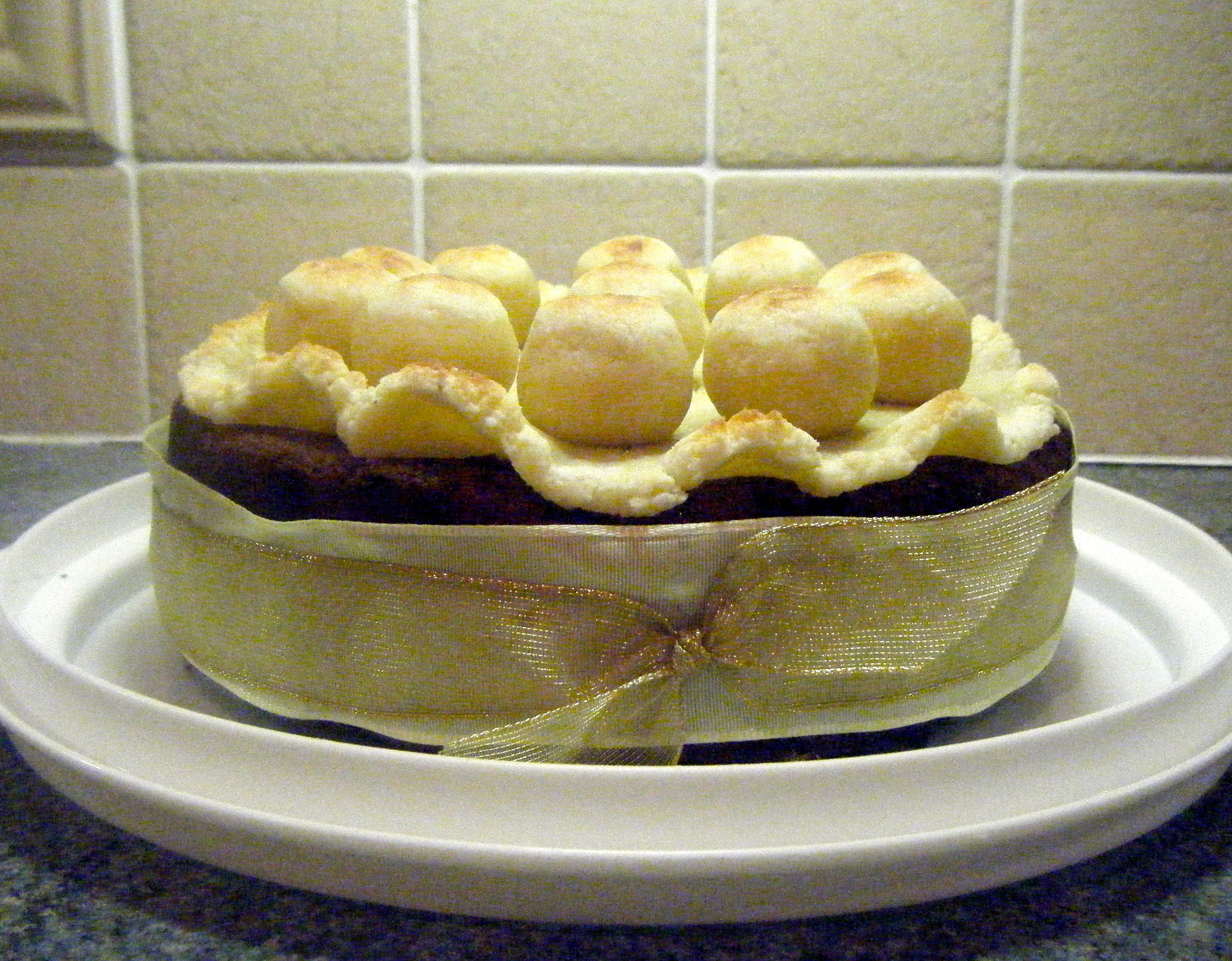 I made my 11 balls which all weighed 20g and I positioned them on top of my cake tin base to get an idea of the approximate positions to fit all 11 onto the cake.  I put a blob of jam onto the bottom of each ball and placed them onto the cake.  I still got the positioning slightly wrong and ended up with 10 in a circle and the eleventh sat nicely in the middle 🙂
