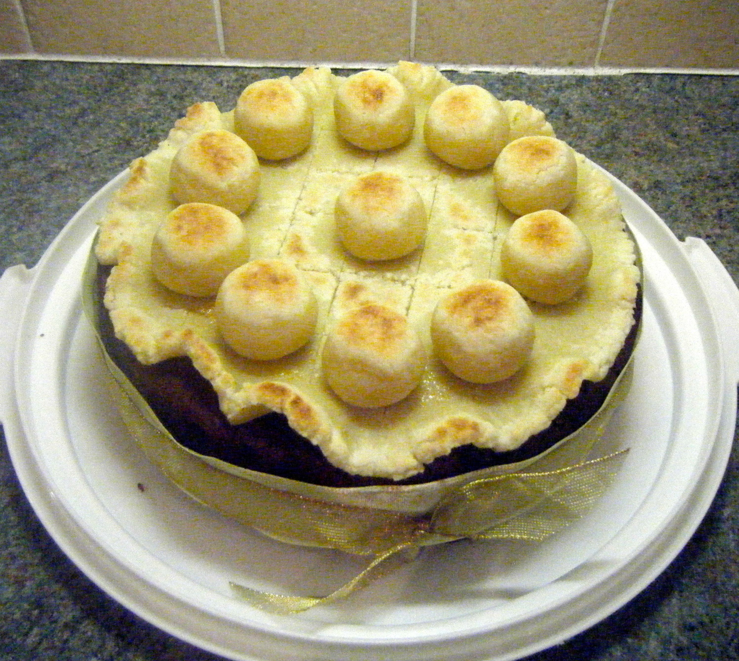 With all the balls in place, I put the cake under the grill to brown the marzipan.  I stood and watched the oven like a hawk because I thought it would catch really quickly.  I was right! Once the marzipan had started to brown, I quickly took the cake out the oven and left it to cool before applying the yellow ribbon.