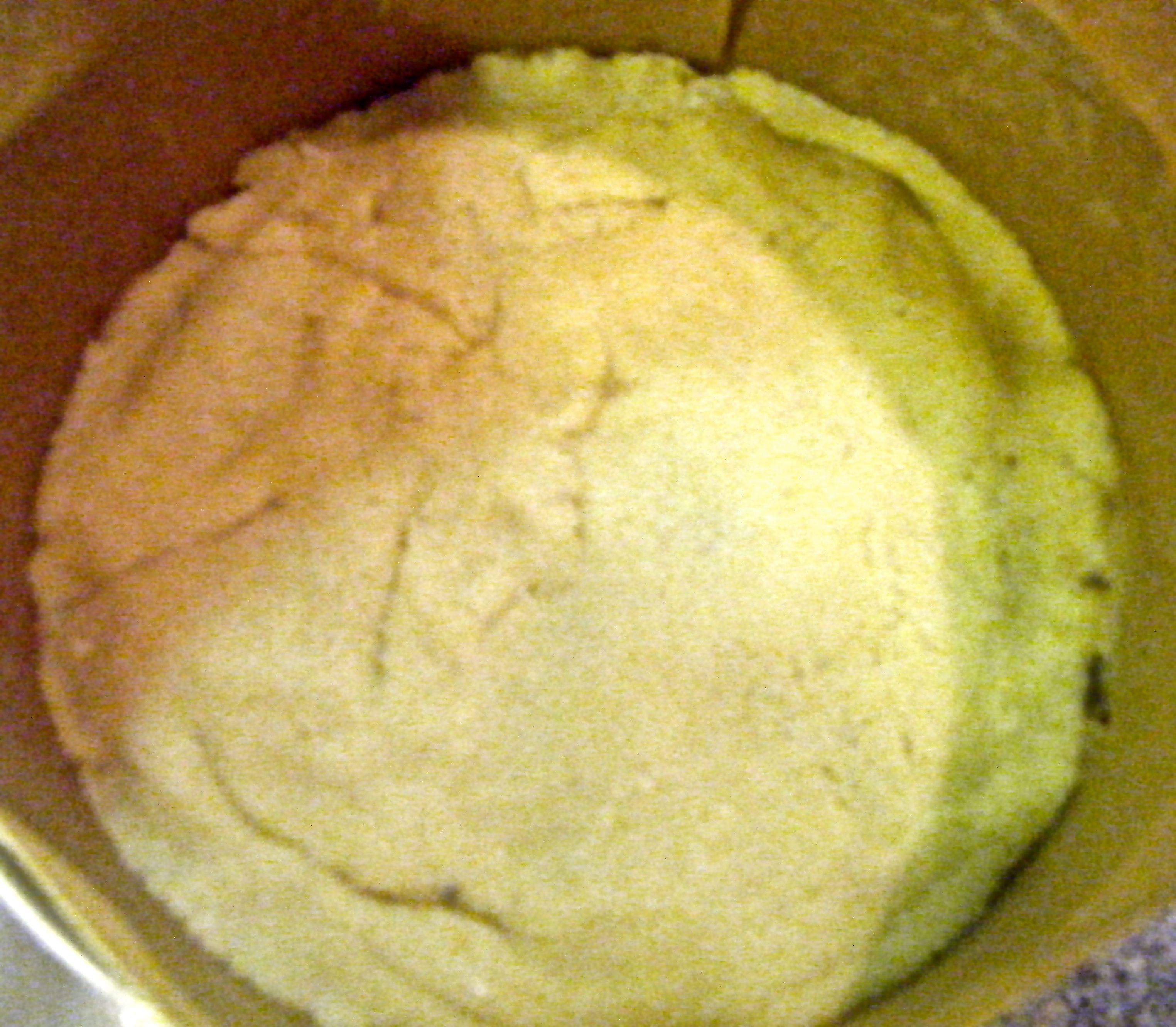 With my marzipan rolled out, I used the cake tin to imprint a slight circle and used a knife to cut out a circle slightly larger.  I then used a rolling pin to pick up the round and put it in my tin.  This didn’t really work and the circle broke but I just squished it back together again, making sure it reached all sides of the tin.