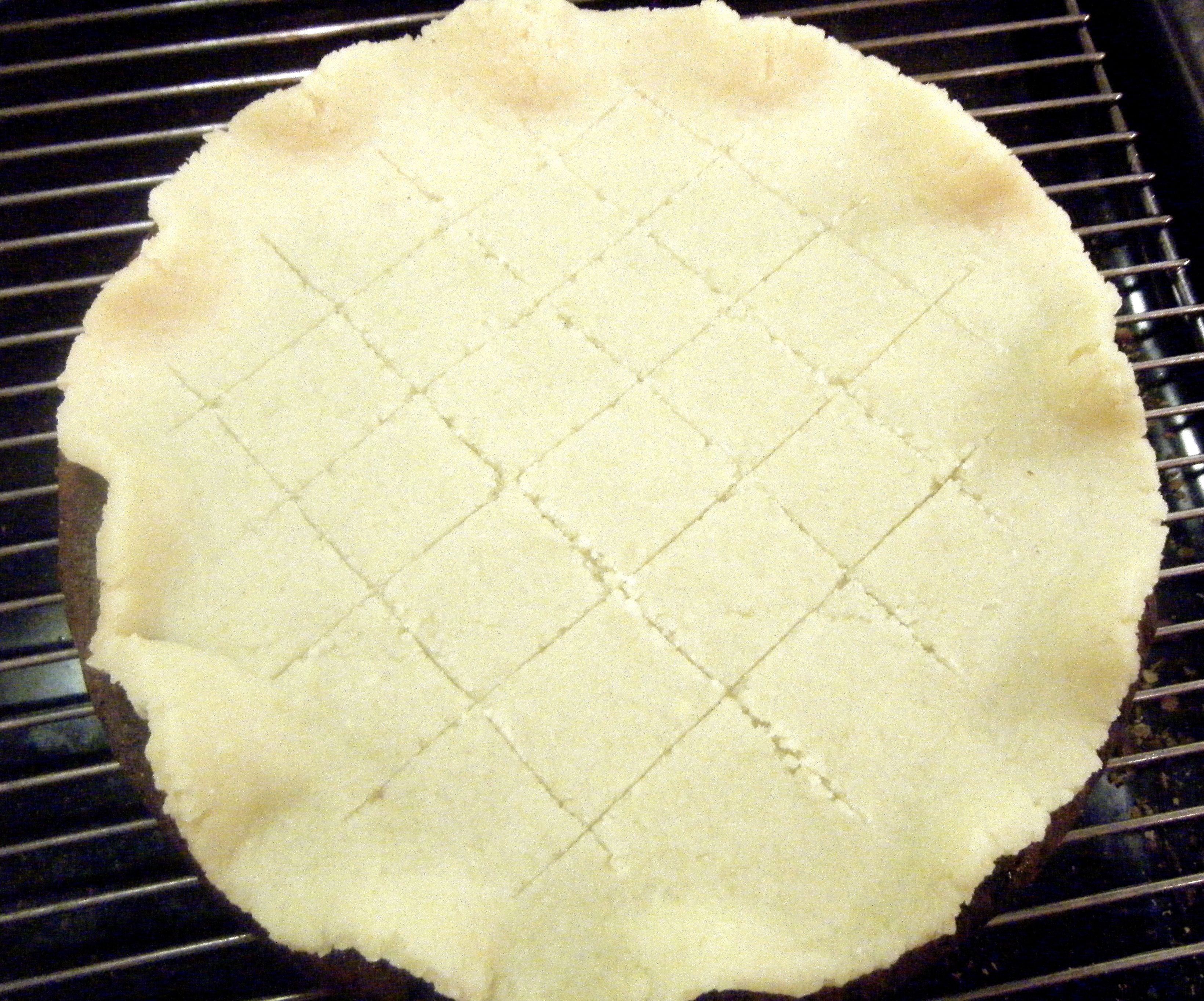 I brushed the top of my cake with the jam and put the marzipan on top (it stayed in one piece this time!).  I then fluted the edges and scored the criss-cross pattern.