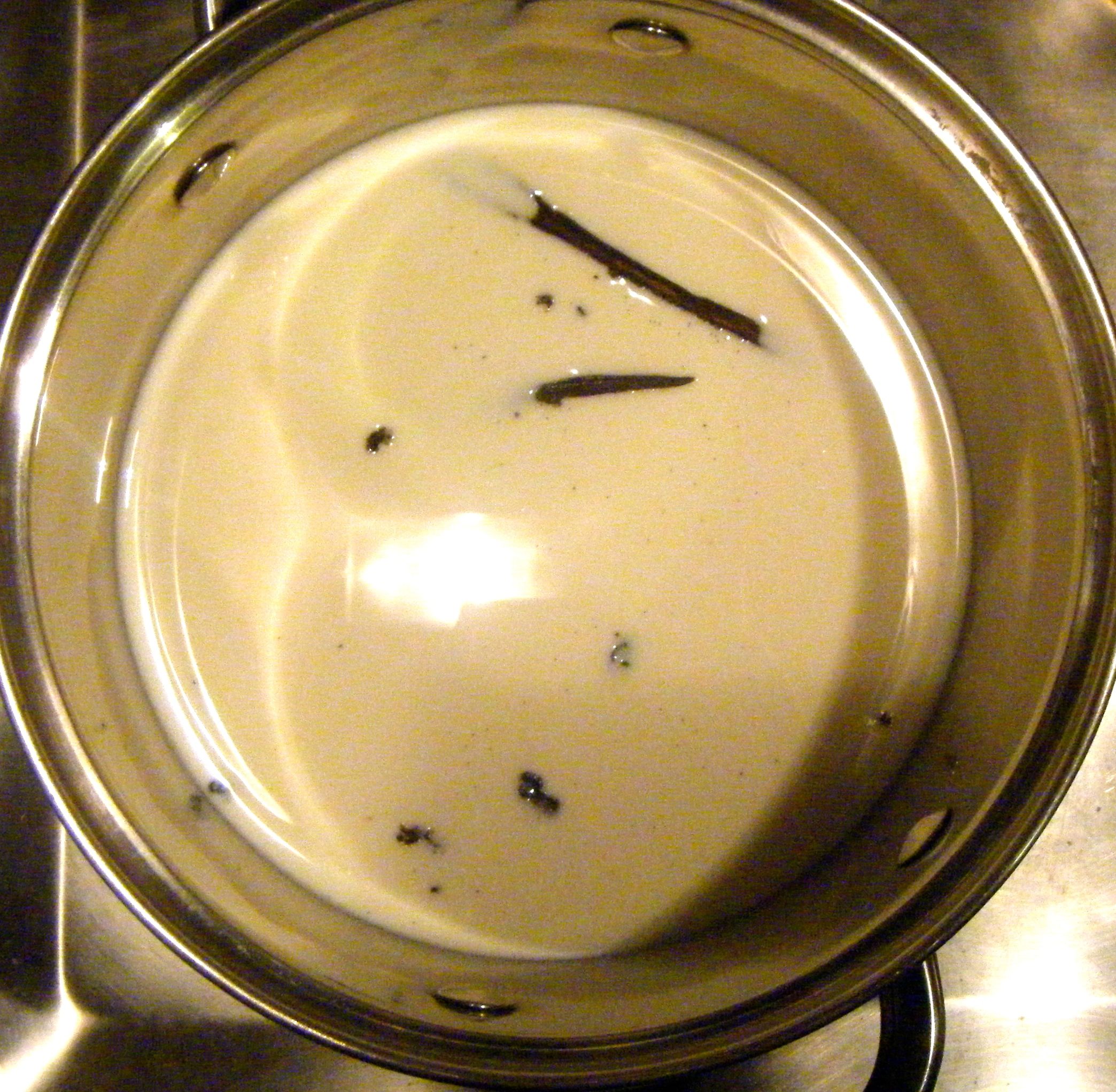 When the pie had about 15 minutes left to go, I got started on my custard. I put the milk, cream and vanilla pods and seeds into a pan over a low heat.