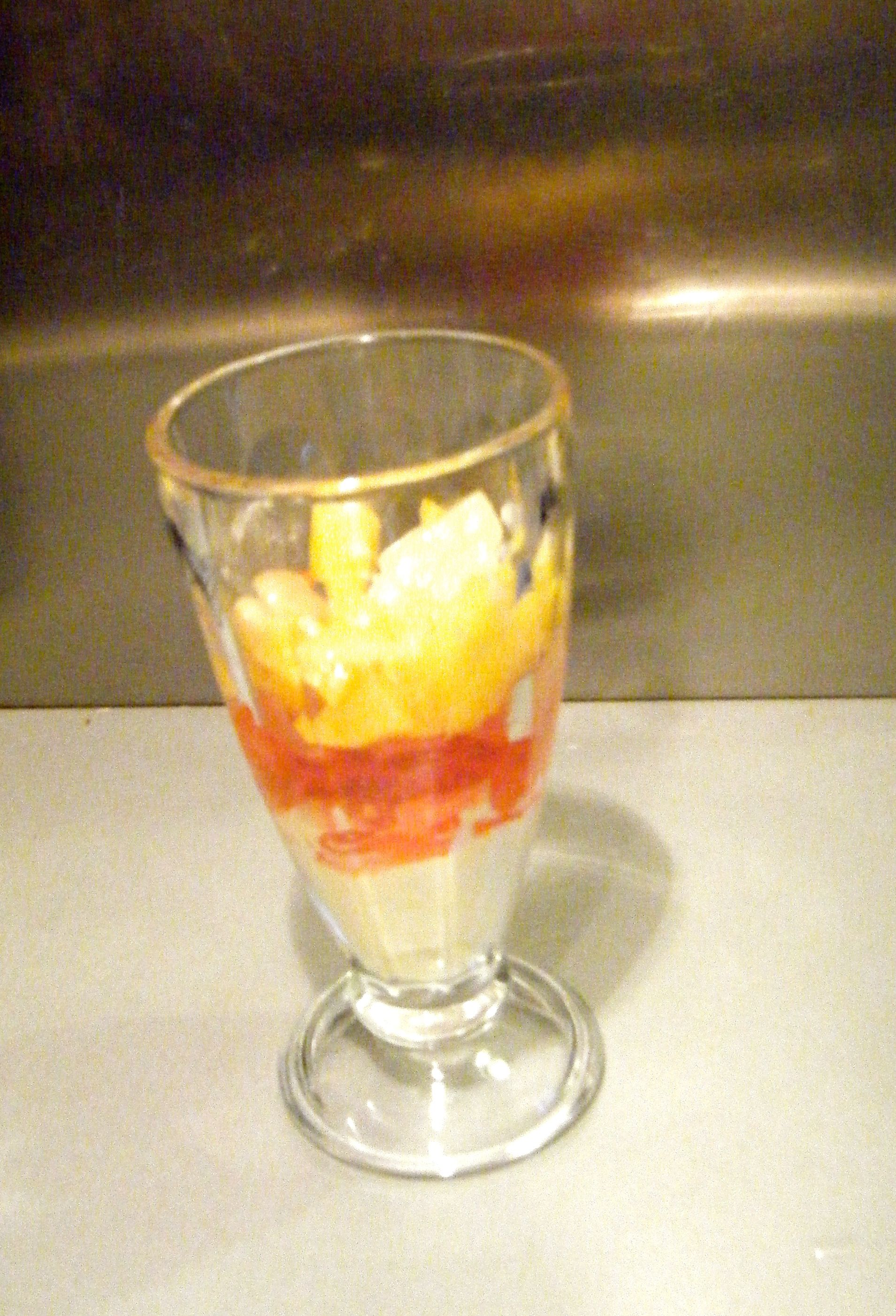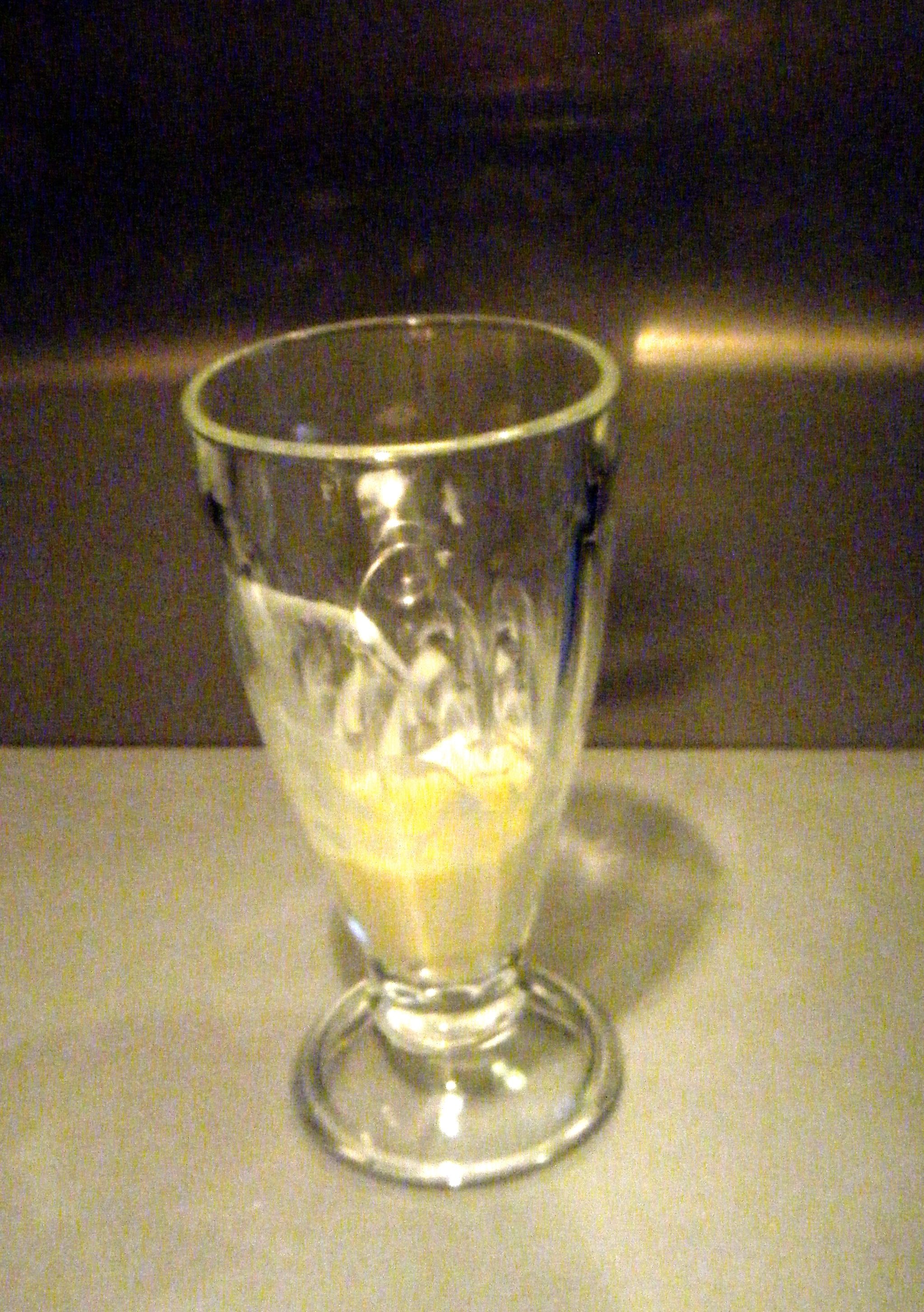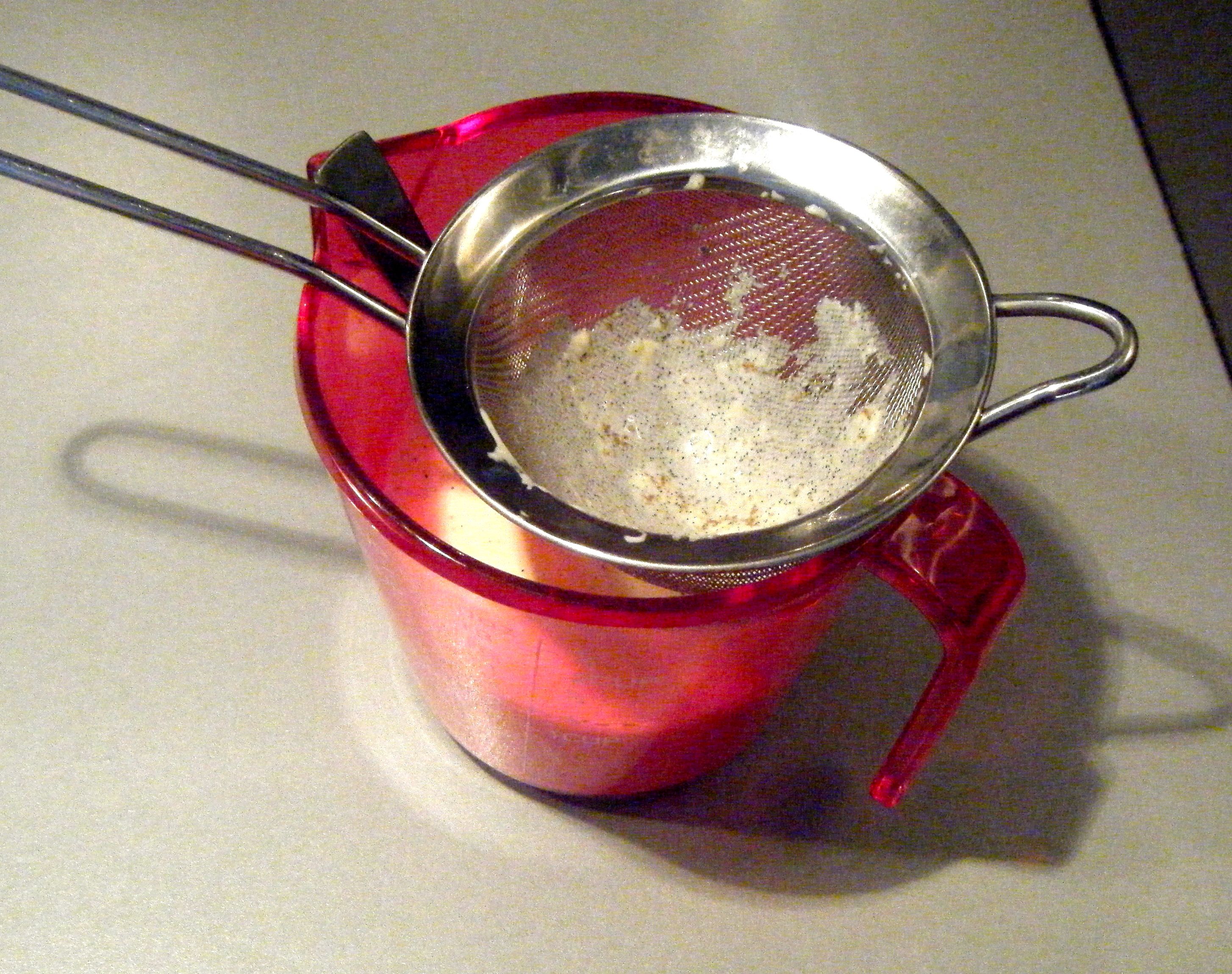 Once the milk/cream mixture had come up to a simmer, I poured it through a sieve into a pouring jug. I whisked the egg yolks and sugar together using a fork and then slowly added the sieved milk/cream mixture, being sure to whisk constantly (now with a balloon whisk).