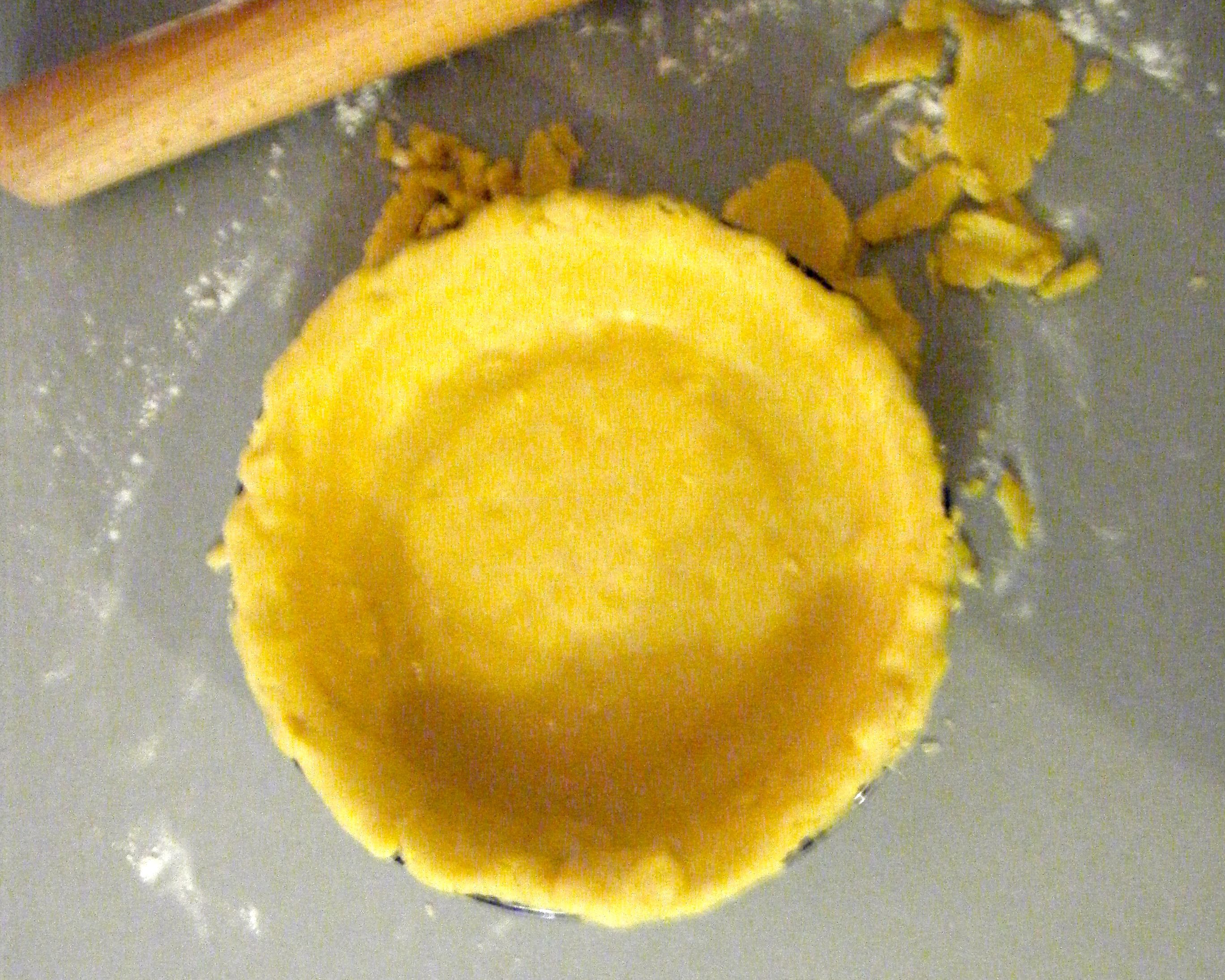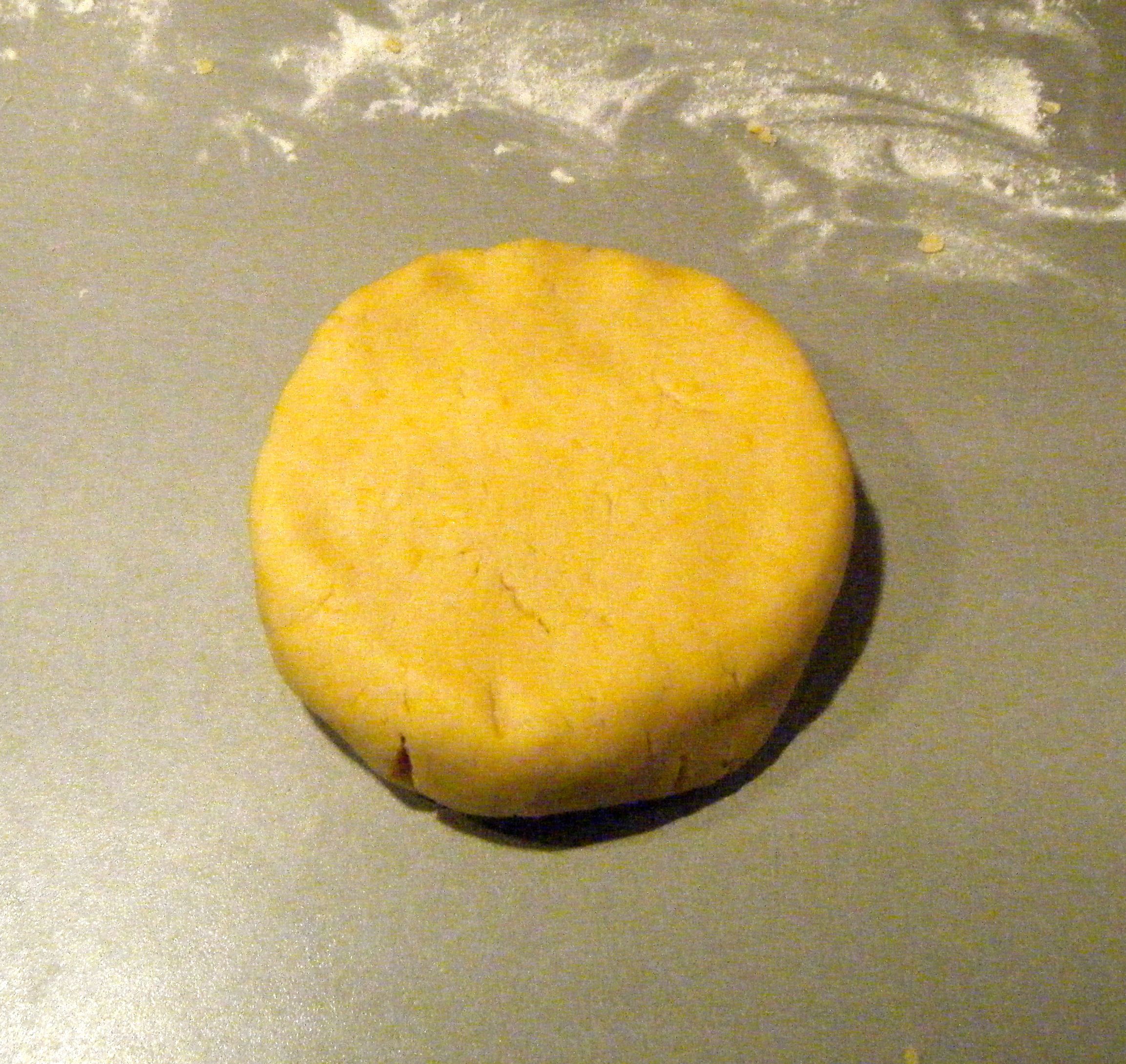 When I came to add the egg yolks, this didn’t work! I tried to blitz it but the ingredients were too packed in to get an even mix. So I tipped it out into a bowl and brought it together by hand. After working it for a while in the bowl, I tipped the pastry onto a lightly floured surface and gently kneaded it until it became smooth. It was quite a crumbly mixture so took a bit of working but it got there in the end. I then shaped it into a disk, wrapped it in cling film and popped it into the fridge to rest.