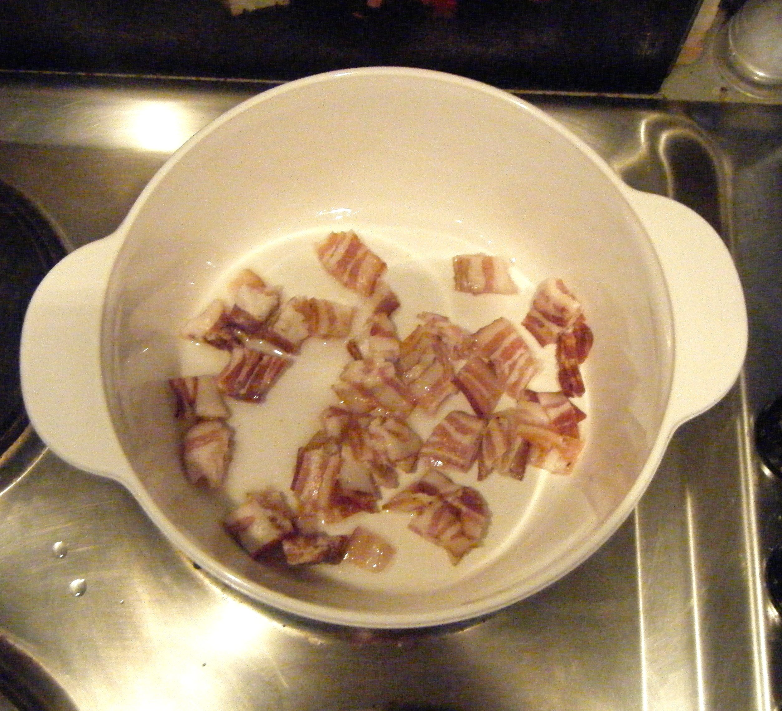 I wrapped the breadcrumbed balls in a piece of bacon and pushed a skewer through the bacon and cheese centre.